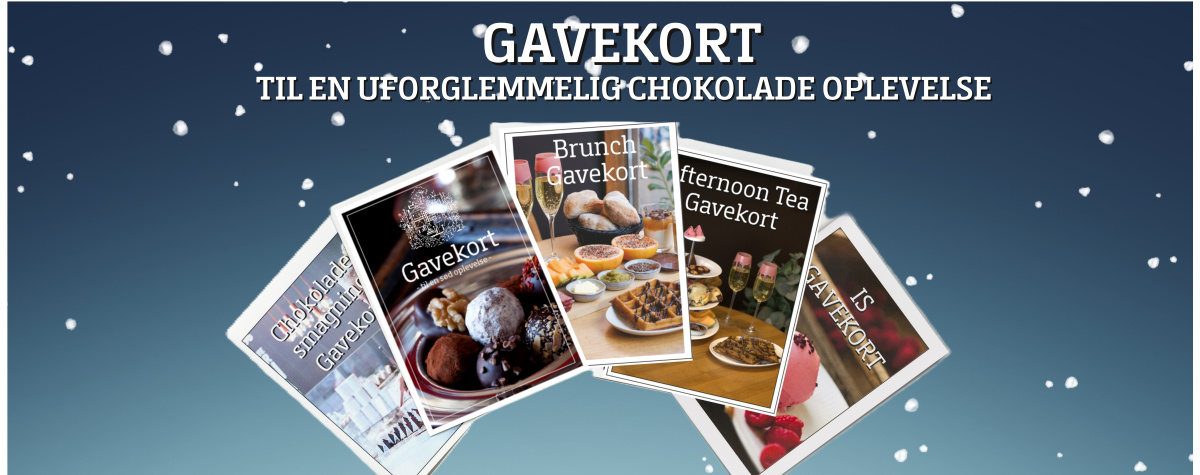 Giv en oplevelse til en du holder af. Der er masser af chokoladeoplevelser at vælge imellem – lige fra den overdådige Afternoon Tea, vores populære Chokoladebrunch, eller vores lækre is univers. Du kan selvfølgelig også give et helt almindeligt gavekort. Du kan enten vælge et fysisk eller et elektronisk gavekort. Og vi vedlægger gerne en personlig hilsen.